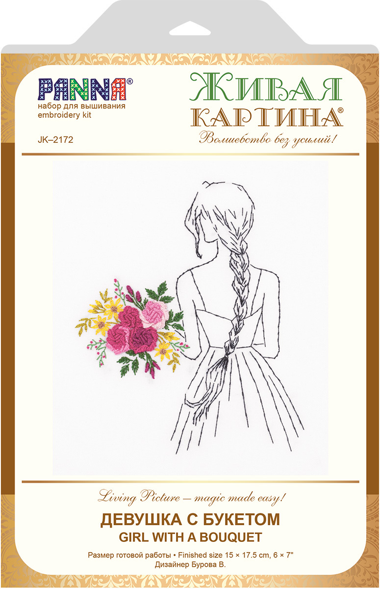 В набор PANNA входит: ткань с нанесенным рисунком, хлопчатобумажные нитки мулине "Gamma" на держателе, игла для вышивания "Gamma", подробная пошаговая инструкция с цветными фотографиями.