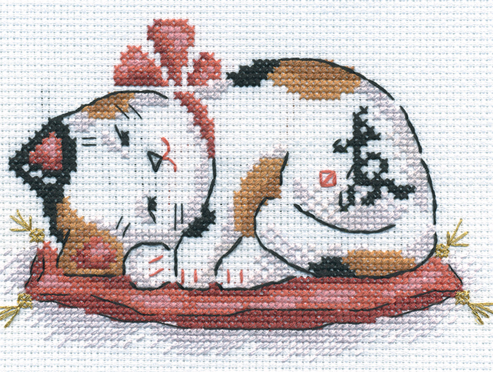 Кот Манэки-нэко символизирует счастье, удачу и богатство. Существует поверье, что вышитый спящий котик приносит благополучие в дом.
