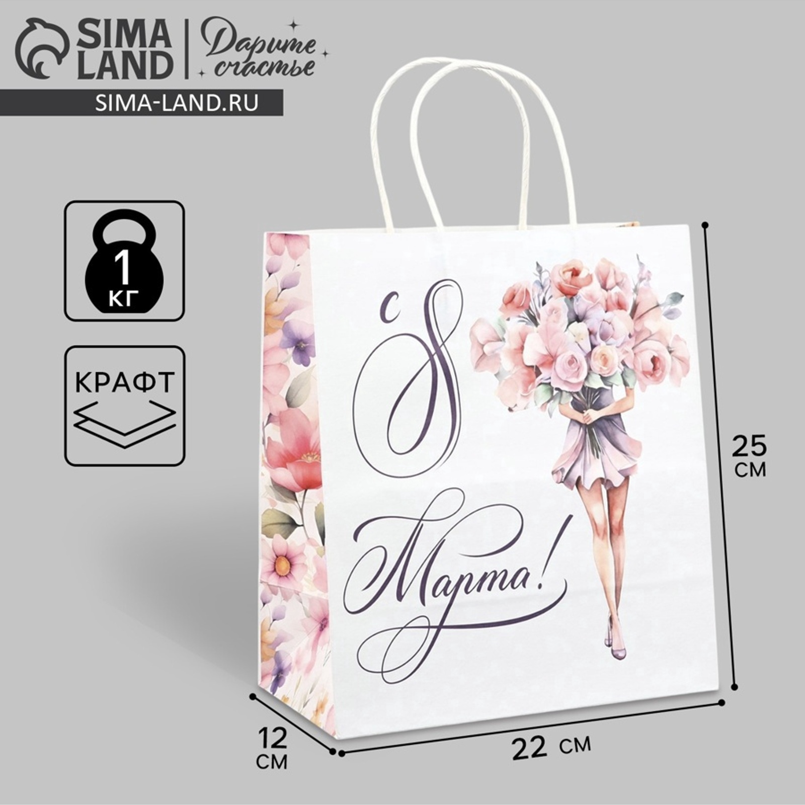 Пакет подарочный крафт «8 марта», цветы, 22 × 25 × 12 см 10453796